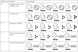 Having routinely utilized the SCT over a decade at our tertiary referral subspecialty clinical practice, we began to recognize recurring patterns of leakage. The fundamental principle behind MSIGS is distinguishing leakage that is predominantly visible as drips versus a visible stream under stress to grade the degree of SUI. MSIGS grades leakage with the SCT on a scale of 0 to 4, with 0 being no leakage at all to 4 being an early and persistent urinary stream with cough (Figure 1), also demonstrated by previously published online video (14). The observed leakage must be synchronous with the cough as persistent leakage after the cough has subsided is indicative of cough induced detrusor overactivity. This test can be performed at the first clinic visit to evaluate a man’s SUI and has virtually no burden to the patient. MSIGS, based on the SCT, has a strong positive correlation with both the subjective PPD count and the objective 24-hour pad weights (1). This exam has become an integral part of our standard evaluation for any patient presenting with SUI (14,15). We propose that MSIGS utility is derived from its ability to evaluate residual urinary sphincter function, with mild scores suggesting healthier peri-urethral tissue (16).