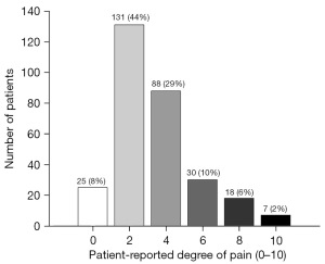 The median score of patient-reported pain was 2 (IQR: 2–4). Distribution of pain scores is presented in Figure 1. Significant pain (score ≥6) was reported by 55 (18.4%) patients.