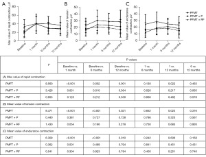 Pelvic floor muscle function was examined by Glazer assessment before the treatment and at 1, 6, and 12 months after treatment. Among the 3 treatment groups, at 1, 6, and 12 months, the maximum values of rapid contraction in the PMFT group and PMFT + P group were significantly higher than the baseline values before treatment (P<0.05). In the PMFT + RF group, the maximum values of rapid contraction were significantly higher than the baseline values before treatment, but there was no significant statistical difference (P>0.05). Among the 3 treatment groups, the maximum value of rapid contraction showed a gradually decreasing trend with the passage of treatment time (Figure 2A).