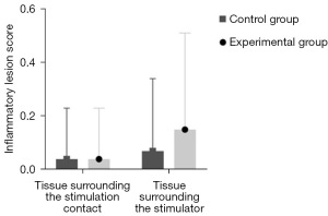 There was no extensive inflammation observed in the tissues surrounding the stimulation contacts or the implant in either the control group (inactive stimulator side) or the experimental group (active stimulator side) (Figure 4). Figure 5 shows representative HE-stained sections at 400× magnification, demonstrating similar histological features between groups, with no evidence of necrosis or severe infiltration. The semi-quantitative inflammatory scores are summarized in Table 1. Compared to the control group, the experimental group showed no significant difference in the inflammation lesion scores of the tissues surrounding the stimulation contacts. While the inflammation lesion scores of the tissues surrounding the implant were slightly higher in the experimental group, the difference was not statistically significant (Table 3, Figure 5).