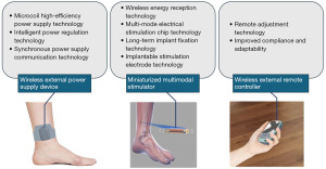 Previous studies have suggested that the tibial nerve shares partial neural root pathways with the pelvic nervous system controlling bladder function, making TNS potentially effective in regulating spinal nerves to modulate bladder activity (16). Low-frequency electrical stimulation can regulate afferent nerve activity and reduce involuntary detrusor contractions (17). Additionally, it may activate the prefrontal cortex to modulate bladder sensory pathways, thereby reducing the frequency of urgency perception (18). Previous animal studies have demonstrated the importance of optimizing stimulation frequency and neural targets. Li et al. [2017] reported that SNM at 15 Hz significantly increased bladder capacity in pigs with AA-induced overactivity, while higher frequencies provided no additional benefit, highlighting the value of frequency-specific modulation (19). In another porcine model, Li et al. [2017] showed that combined tibial and sacral nerve stimulation significantly improved bladder capacity (to 50.2% of baseline), outperforming either modality alone (20). These findings support the rationale for programmable multi-modal stimulation, as provided by our device, to achieve greater therapeutic flexibility and efficacy. Since the 21st century, TNS therapies, including percutaneous and surface electrode methods, have been progressively developed and approved by the U.S. Food and Drug Administration (FDA) for clinical use (21,22). Although earlier studies on patch-based transcutaneous TNS have shown mixed or limited efficacy, recent clinical evidence from wearable systems has demonstrated more promising results. For instance, the Vivally System (Avation Medical, California, USA), a non-invasive, wearable TNS device, was evaluated in the multicenter FREEOAB trial (23). Despite these advantages, wearable TNS systems still rely on consistent patient adherence and weekly usage protocols. More recently, implantable stimulators such as eCoin and Revi have further advanced treatment methods, achieving long-term automated stimulation via miniaturized designs and improving patient compliance (13). However, these devices still face challenges, such as short lifespans and limited treatment efficacy.
