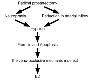 A reduction in arterial inflow was also reported by several authors. This is associated with the ligation of accessory internal pudendal arteries during prostatectomy (25,26). Combination of nerve damage with decreased arterial inflow may intensify hypoxia and ultimately lead to apoptosis which is an underlying cause of post RP induced ED. User et al. performed bilateral neurotomy of the rat penis and found that there was significant apoptosis in the subalbugineal smooth muscle cells. With apoptosis in the region of the subtunical venular plexus, a defect in the veno-occlusive mechanism of the corpus cavernosum occurs (27). McVary et al. recently confirmed that a 12-fold increase of apoptosis happened in penile smooth muscle in rats whose cavernous nerves were disrupted (28).The current understanding of ED after RP is summarized in Figure 1.