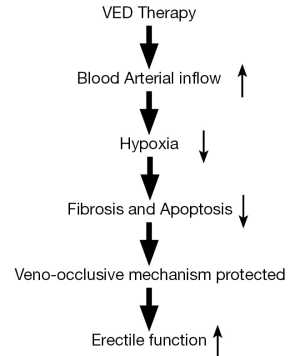 To understand the mechanism of VED in penile rehabilitation, we designed a rat specific VED based on the principle of human VED (13). An underlying mechanism exploratory study was carried out on rats with bilateral cavernous nerve crush (BCNC) model. Sprague-Dawley (SD) rats were randomly assigned into three groups: sham, BCNC, and BCNC plus VED. VED therapy began 2 weeks after BCNC surgery, 5 mins twice daily from Monday to Friday for 4 weeks. The study showed that VED therapy could decrease the HIF-1a, TGF-β1 and Terminal deoxynucleotidyl transferase biotin-dUTP nick end labeling (TUNEL) expression and increase Intracavernous Pressure/Mean Arterial Pressure (ICP/MAP), endothelial nitric oxide synthase (eNOS), alpha smooth muscle actin (α-SMA) and masson’s trichrome (MT) expression in BCNC rat model. This study first demonstrated the effectiveness of VED therapy on ED in the nerve injury rat model. The beneficial effect of VED therapy may relate to anti-hypoxia, anti-fibrosis and anti-apoptosis mechanisms (37). A further study was performed to estimate the effect of VED therapy on penile length and cavernous oxygen saturation (SO2) in the BCNC rat model. Penile length and diameter were measured on a weekly basis. After 4 weeks of therapy, penile blood was extracted by three methods for blood gas analysis: Method 1, cavernous blood was aspirated at the flaccid state; Method 2, cavernous blood was aspirated at the traction state; Method 3, cavernous blood was aspirated immediately after applying VED. SO2 values were tested by the blood gas analyzer. Our unpublished data showed that VED therapy is effective in preventing penile shrinkage induced by BCNC. Also, the penile SO2 was increased by VED application compared to flaccid or traction groups. The calculated blood constructs in corpus cavernosum right after VED application were more arterial blood than venous blood. This study further suggests that VED therapy can effectively preserve penile size in the cavernous nerve injury animal model. This study also provided the direct basic scientific evidence that VED therapy increases arterial inflow.