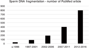In the article by Agarwal and colleagues (15), SDF testing is critically presented with some of the limitations expressed above and suggested for specific clinical situations for assisting andrologist and reproductive specialists in understanding the circumstances in which SDF could be of clinical value. The main assumption of this article and its clinical value lie in the worldwide exponential increase in last years in SDF analysis, unfortunately without actual clinical evidence of a real benefit (for the diagnosis and prognosis of male infertility) of the test and interpretation of their results. Indications for SDF suggested by the authors are varicocele, unexplained infertility, recurrent pregnancy loss, recurrent ART failure, and lifestyle risk factors such as ageing, smoking and environmental/occupational exposures. These clinical situations could actually represent good indications for SDF testing, but the grade of evidence for recommendation, as also reported in this article (15), is very low (grade C in most part) and based on poor quality studies (retrospective, case series, expert opinion). Although the number of publications dealing with SDF exponentially increased in last years (Figure 1), randomized, controlled, prospective clinical trials on this topic are lacking. From my point of view, SDF, also in such clinical conditions, should be performed especially in men presenting with normal semen parameters on standard semen analysis, as in these cases SDF could add information, and only after a careful diagnostic approach to the male partner of and infertile couple. As SDF might result from excessive reactive oxygen species (ROS) production and/or low seminal antioxidants, this test could also be informative for making decision on treating the infertile male with antioxidants and nutraceuticals (16). Another major prerequisite for appropriate interpretation of SDF testing is that laboratories use standardized methods, qualified personnel and quality control programs.