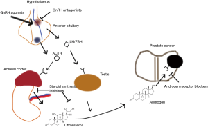 Androgen deprivation therapy (ADT) is the oldest class of targeted agents used in human malignancies. The classic studies in the early 1940s by Huggins and Hodges (1,2) established how castration arrested the growth of prostate cancer cells and suppressed serum prostate phosphatases in metastatic prostate cancer. Eventually, agents for chemical castration were developed that replaced surgical castration a few decades later. The first chemical castration agents were estrogen and estrogen analogues [diethylstilbestrol (DES)] that centrally suppressed the hypothalamic-pituitary-androgen (HPA) axis via the classically recognized negative feedback mechanism. These agents were eventually replaced by analogues that did not have an estrogenic effect, leading to durable suppression of the HPA axis with less gynecomastia (3). The Leuprolide Study compared leuprolide and DES in a randomized fashion, finding no significant difference in survival for patients with metastatic prostate cancer, but they did report lower rates of gynecomastia, thromboembolism and edema in the leuprolide group (4). Subsequently, leuprolide and other gonadotropin releasing hormone (GnRH) agonist formulations became the most common chemical castration agents. As further studies elucidated the various players in the androgen pathway, new castration agents were developed, often to augment the effect of GnRH agonists (Figure 1). In certain circumstances, more general drugs such as ketoconazole (which acts as a steroid synthesis inhibitor) or corticosteroids are used to augment castration in patients who do not respond to or are not candidates for more targeted agents, but these agents generally have more off-target effects.