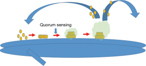The trigger of microbial colonies to create biofilms is largely dependent on the environment (e.g., subinhibitory concentrations of antibiotics and the presence of pigments and iron siderophores) (22). Intricate communication systems between adjacent bacteria allow purposeful alterations in colony structure and function, including quorum sensing, chemotactic signaling and plasmid exchange [reviewed by Ben Jacob et al. (23)]. In quorum sensing, cell-to-cell communication synchronizes clonal behavior based on microbial density and nutrient supply. Cell-to-cell communication can also occur through the production of signaling molecules called autoinducers, which manipulate the gene expression of other intra-and interspecies bacteria (24).