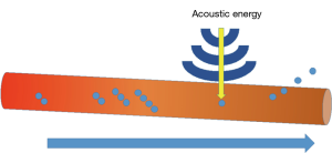 Mechanical disruption represents another method of biofilm disruption. First developed as a gas-filled micrometer-sized particle encapsulated by a stabilizing shell of either lipids, proteins, or other polymers with the intent of increasing ultrasonography resolution, microbubbles gained additional diagnostic and therapeutic indications in multiple disciplines of medicine. Microbubble-assisted ultrasonography now allows targeted drug delivery (45,46), delineates anatomy intraoperatively (47), facilitates gene therapy through alterations in cell membrane permeability (48), and creates the cavitations necessary for mechanical disruption of biologic fluid and tissue membrane interfaces (Figure 2) (49). Li et al. (50) recently compared ultrasound targeted microbubble destruction (UTMD) to the combined effect of UTMD + cationic antimicrobial peptide, Human β-3-defensin 3 (HBD-3), on S. epidermidis and S. aureus biofilm coated titanium plates implanted into a mouse model. Three days after treatment with either ultrasound (US) alone, UTMD or UTMD+HBD-3 at various doses, the number of viable colony forming units (CFU) and biofilm densities were compared. The number of viable CFUs per square centimeter significantly decreased in biofilms treated with HBD-3 + US and HBD-3 + UTMD, with the lowest CFUs observed in the cohort of mice treated with HBD-3 and UTMD. The authors showed enhanced antimicrobial activity of HBD-3 with the addition of UTMD. However, the degree of the air bubble’s mechanical insult effect depends on biofilm age and biofilm thickness and additional studies need to be performed to determine whether microbubbles and antimicrobial peptides will play a role in preventing and treating biofilms attached to IPPs.