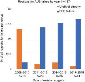 For the cases with available data on date of primary AUS placement (92%), median time to AUS revision or replacement surgery from the date of immediate prior AUS placement was 18.4 months (IQR 6.1–48.1 months). The mean time to revision was longest for reoperation due to urethral atrophy (42.0 months) compared to PRB failure (27.0 months), cuff failure (37.7 months), and pump failure (15.7 months). Of revisions performed from 2008–2010 in our cohort, 33.3% were cited as due to urethral atrophy, while the incidence of atrophy decreased to 4.3%, 5.45%, and 2.4% amongst revisions performed in 2011–2013, 2014–2016, and 2017–2019, respectively. Revisions due to PRB failure made up 5.56% of AUS revisions performed from 2008–2010, and increased to account for 34.8%, 38.2%, and 41.5% of revisions performed in 2011–2013, 2014–2016, and 2017–2019, respectively (Figure 1).