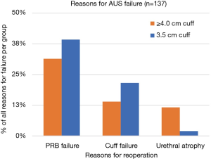 Of the 137 revision surgeries, 51 (37.2%) involved previously placed 3.5 cm cuff AUS systems [median follow-up 54.2 months (IQR 28.4–90.4 months)], and 86 (62.8%) were on previously placed ≥4.0 cm cuff AUS systems [median follow-up 52.7 months (IQR 13.6–95.7)]. No tandem cuffs were placed at the time of AUS revision/replacement. Fewer reoperations occurred due to urethral atrophy in the 3.5 cm cuff group (1/51, 2.0%) compared to the ≥4.0 cm cuff group (10/86, 11.6%, P=0.05) (Figure 2). PRB failure was the leading reason for reoperation for both the 3.5 cm cuff group (20/51, 39.2%) and the ≥4.0 cm cuff group (27/86, 31.4%). There were no other significant differences between the two groups regarding the number of AUS failures attributed to a certain cause (Table 2).