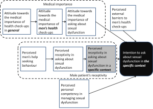 Managing male sexual dysfunction in primary care settings is challenging because it is a sensitive issue and a taboo subject for male patients. Although the issue of managing sexual dysfunction from the doctors’ perspective has drawn considerable attention in an attempt to improve diagnostic rates and service delivery, most of the studies tend to be descriptive. This study has managed to demonstrate the impact of perceived male patients’ receptivity and personal competency on doctors’ intentions to ask about sexual dysfunction in primary care clinic settings. This study has also managed to identify the relative importance of these determinants in different contexts of consultation. As a whole, this study proves the relevance of the conceptual framework in explaining the doctors’ intention in asking about sexual dysfunction in male patients.