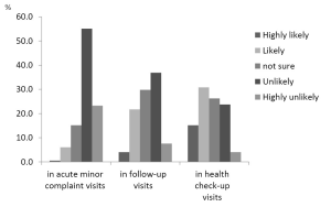 Although majority of doctors were very unlikely or unlikely to ask about sexual dysfunction in their consultation especially during acute minor complaint visits, more doctors were likely or very likely to do so in health check-up visits (Figure 2). There was substantial percentage (26.3-29.8%) of doctors unsure about their intention to ask about sexual dysfunction in follow-up or health check-up visits (Figure 2). Only 25.8% and 46% of doctors intended to ask about sexual dysfunction in the follow-up and health check-up visits of a middle age man respectively.