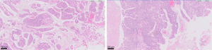 - Amin MB, Ro JY, Silva EG, et al. Micropapillary variant of transitional cell carcinoma of the urinary bladder. Histologic pattern resembling ovarian papillary serous carcinoma. Am J Surg Pathol 1994;18:1224-32. [Crossref] [PubMed]
