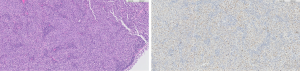 The LEV of UC is characterized by syncytial growth pattern of a malignant epithelial component with prominent nuclei and nucleoli, which is densely infiltrated by lymphoid cells predominantly composed of cytotoxic T lymphocytes (63) (Figure 2). These cells may resemble metastatic tumours from the nasopharynx and the strong expression of CK7 would be able to demonstrate a urothelial origin of tumour (64). Other differential diagnosis of malignant lymphomas, undifferentiated UC with lymphocytic infiltrate and small cell carcinoma of the bladder can also be differentiated with the relevant IHC.