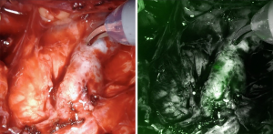 Several novel techniques have recently been reported for robotic UEAS repair. Padovani et al. [2017] recently reported a series of 3 cases of ureteroileal bypass surgery, 1 of which was performed robotically (25). Instead of dissecting out and redoing the previous anastomosis, the authors performs a 1 cm side-to-side anastomosis using a more proximal segment of the ureter. This approach mirrors the non-transecting ureteral reimplant for traditional distal ureteral injury/obstruction. The authors reported a mean operative time of 120 minutes, no complications, and 100% success rate with a mean follow-up of 29.3 months (25). Lee et al. [2018] reported 8 patients with 10 renal units who underwent robotic UEAS revision with the assistance of indocyanine green (ICG) (26). ICG was injected through a retrograde ureteral catheter and/or nephrostomy tube (if present). The area of ureteral narrowing was identified by its lack of fluorescence (Figure 1). This technique allowed the authors to characterize the stricture(s) and determine the proper procedure. There were 3 (37.5%) minor and 2 (25%) major complications (bilateral pulmonary emboli and ureteral stent dislodgement requiring nephrostomy placement). The median length of stay was 6 days. 80% of the renal units remained disease-free radiologically and clinically with a mean follow-up of 29 months (26).