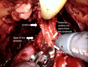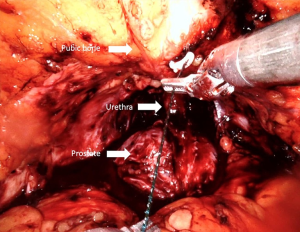 Control of the dorsal venous complex (DVC) is one of the key steps of RARP (Figure 5) (Video 1, Part-1), since it affects blood loss, appropriate apical dissection, and therefore postoperative continence. According to the European Association of Urology Robotic Urology Section (ERUS) survey conducted in 2012, 90.5% of surgeons who participated in the questionnaire declared that they manage the DVC by selective sutures instead of by stapler ligation and energy usage (61).
