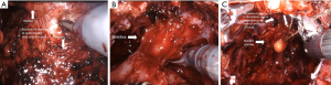 Recent studies indicated that the course of NVBs is much more variable than previously suggested and are primarily located either on the anterior surface of the prostate or in the posterolateral region (NVBs) (46-48). Further, the number of nerves located anteriorly increases 6% to 11.2% from the base to apex (49). As such, a high nerve release technique, also referred to as Veil of Aphrodite, was suggested to improve functional outcomes (50,51). This procedure proposes intrafascial/interfascial dissection between the 1 o’clock and 5 o’clock positions for the right side and between the 6 o’clock and 11o’clock positions for the left side (Figure 3). Ghani et al. (52) then modified this technique and suggested the preservation of tissue between the 11o’clock and 1 o’clock positions, including pubovesical ligaments. This procedure (super veil) was more challenging than the standard one, so it was offered for patients in the low-risk group (Video 1, Part-1).
