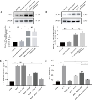 Firstly, BTLA and CTLA-4 expression intervened by BTLA-overexpression adenovirus and Belatacept on T cells was measured using western blot and qRT-PCR. As shown in Figure 1A and B, the expression of BTLA and CTLA proteins were upregulated induced by BTLA-overexpression adenovirus and Belatacept (the BTLA + CTLA-4 group) compared with the naive T cell (the normal group).
