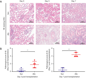 We established the rat kidney transplant model (n=5 for each group) to show the process of AR. Figure 2A shown ischemia reperfusion injury as well as renal tubule edema without graft rejection were observed at day 3 and day 7 after transplantation in the Syn group. By the contrast, serious renal tubular injury, interstitium monocyte infiltration and intimal arteritis were found at day 3, especially at day 7 in the Allo group. The pathological classification according to the Banff 2017 score revealed the occurrence of AR at day 3 and day 7 after transplantation (Figure 2B).