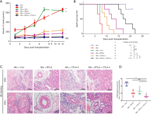 We overexpressed BTLA and CTLA-4 expression in the model as described in Methods. Results of SCr detection from the serum samples among each day showed that recipients of the Allo and the Allo + Con group had taller SCr level than those in the Syn group, but no difference found between the Allo and the Allo + Con group. On the contrary, a significantly lower SCr level existed in the Allo + BTLA + CTLA-4 group in contrast to the Allo + Con group (Figure 3A, P<0.05). Recipients in the Allo + BTLA + CTLA-4 group had a prolonged graft survival time compared with the Allo + Con group (17.5 vs. 7 days, median survival time) (Figure 3B). Our data exhibited the graft tissues of the Allo + BTLA group showed remarkly reduced renal injury with monocyte infiltration compared with the Allo + Con group, which displayed acute TCMR at day 7 similar to the Allo group in Figure 2A. Furthermore, kidney tubulitis, interstitium monocyte infiltration and intimal arteritis reduced in the Allo + BTLA + CTLA-4 group than that in the Allo + Con group (Figure 3C). The pathological score shed light to a reduction of TCMR following renal transplant in the Allo + BTLA + CTLA-4 group in contrast to the Allo + Con group (Figure 3D).