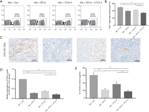 To explore the influence of BTLA and CTLA-4 on the post-transplant T cells number in peripheral blood and graft, we use the flow cytometry and immunohistochemical staining to analyze the expression of CD3+ T cells. As shown in Figure 4A and B, the proportion of CD3+ cells in peripheral total lymphocyte were less on 7 days after transplantation from the Allo + BTLA + CTLA4 group compared to the Allo + Con group, which were rose compared to the Syn group. Based on IHC analysis, infiltration of CD3+ cells in graft were decreased in the Allo + BTLA and the Allo + CTLA-4 group compared to the Allo + Con group, and in the Allo + BTLA + CTLA-4 group were further reduced (Figure 4C,D). Serum levels of inflammatory cytokines IL-2 were tested at day 7 in recipients with ELISA (Figure 4E). The Allo and the Allo + Con groups showed further release of IL-2. However, significantly decreased release of IL-2 was found in the Allo + BTLA, the Allo + CTLA-4 and the Allo + BTLA + CTLA-4 group compared with the Allo + Con group.