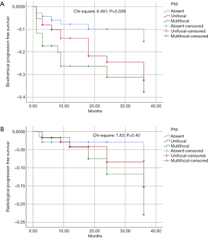 Cox regression analysis to identify predictors of biochemical progression in our population is displayed in Table 4. Univariate analysis had shown that PNI was a significant predictor of biochemical progression with a 2.33-fold higher risk when compared with cases without PNI [hazard ratio (HR): 2.33, 95% CI: 1.03–5.25; P=0.040]. Other significant predictors of biochemical progression at univariate analysis were pathological stage, risk class, ISUP grading and surgical margins status. At multivariate analysis, after adjusting for pathological stage, grading and surgical margins, PNI was no longer a statistically significant predictor of biochemical progression (HR: 1.87, 95% CI: 0.68–3.12; P=0.089).
