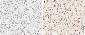 All 150 patients were diagnosed with ccRCC based on the World Health Organization/International Society of Urological Pathology (WHO/ISUP) classification system of renal cell tumors. All included patients in this study received no extra therapy from February 2008 to September 2010 before surgery, and were followed up after surgery until August 2015. All the patients with ccRCC were graded using the WHO/ISUP grading system and divided into two groups by tumor pathology: the clear cell renal carcinoma group and the clear cell renal carcinoma group with other pathological types (clear cell carcinoma with sarcomatoid degeneration, clear cell carcinoma with PRCC, and clear cell carcinoma with ChRCC). In addition, all the patients were divided into several sub-groups by gender (male or female), pathological grade (low pathological grade: grades I and II, high pathological grade: grades III and IV), and tumor size (≤5 or >5 cm). The American Joint Committee on Cancer (AJCC) 7th Edition Cancer Staging System was used for all included cases in this study. The clinical characteristics of patients were described in detail in Table 1. The study was conducted in accordance with the Declaration of Helsinki (as revised in 2013). Informed consent was obtained, and the study was approved by The Ethics Boards of Huashan Hospital (No. 2020-529). All experiments were carried out in accordance with institutional guidelines. Written informed consent was obtained from the patients undergoing surgery.