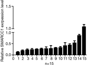 Chromatin remodeling is an important aspect of epigenetics, as it regulates DNA replication, repair, and recombination through dynamic structural changes in chromatin. SMARCC1, also known as BAF155, together with SMARCA4, SMARCA2, and SMARCB1, comprises the SWI/SNF protein family (1). SMARCC1 functions as a helicase and ATPase that can regulate the transcription of certain genes by changing the chromatin structure around these genes. SMARCC1 is part of the ATP-dependent SWI/SNF chromatin remodeling complex and contains a leucine zipper motif that binds to many typical transcription factors. It has been reported that the expression of SMARCC1 is correlated with some human cancers including prostate cancer, colon cancer, and pancreatic cancer (2,3). For example, the expression of SMARCC1 was shown to be upregulated and positively correlated with tumor recurrence and dedifferentiation in prostate cancer (3,4). MicroRNA-202-5p targets SMARCC1 and acts as a tumor suppressor in colorectal carcinoma (5). In addition, SMARCC1 expression mediates drug resistance in pancreatic cancer cells and is regulated by miR-320c (6). We present the following article in accordance with the REMARK reporting checklist (available at http://dx.doi.org/10.21037/tau-20-935).