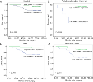 The relationship between SMARCC1 expression and the overall survival of patients with ccRCC was analyzed. The results showed that patients with high SMARCC1 expression had a better prognosis than those with low SMARCC1 expression (80.6% vs. 93.4%, P=0.028). The results also showed that high SMARCC1 expression was correlated with a better prognosis compared with low SMARCC1 expression (40.0% vs. 95.2%, P=0.000) in the high pathological grade (grades III and IV), male (73.5% vs. 95.3%, P=0.004), and tumor size >5 cm (62.5% vs. 89.5%, P=0.044) sub-groups. The results were shown in detail in Figure 3.