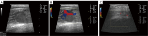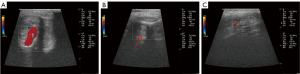 As he had already had 3 previous embolizations and persistent ED, he wished to have a more definitive therapy. He was taken to the operating room for open ligation of the ruptured right cavernous artery. An intraoperative ultrasound helped identify the depth and location of the cystic cavity that was surrounded by a thick fibrous sheath. Once the fibrous sheath was opened, a single arterial bleeder was identified along with several venous outlets within the cystic cavity. Several 4-0 Maxon sutures were used to suture-ligate these bleeders and to imbricate the cystic cavity. He was discharged with Ketoconazole 200 mg twice a day and prednisone 5 mg daily (Comment 4) for one month (2). Postoperative ultrasound 1 month later revealed complete resolution of the arterial sinusoidal fistula and cavity (Figure 1C). The patient regained normal erectile function 3 months later.
