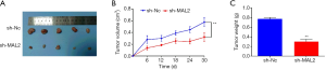 BALB/C mice were purchased from Fuzhou Dingguo Biotechnology Co. Ltd. (Beijing, China). Male nude mice (aged 4–6 weeks with an average weight of 20 grams) were selected. The mice were kept in a constant temperature, humidity and sterile growth environment, and provided with sterile waster and sterile feed. LNCaP-shNC or LNCaP-shMAL2 cells (2×106 cells/ml) were injected into mice (n=5 for each group) subcutaneously. Every 6 days, the tumors were removed to be photographed and weighted. The experiments were approved by the Animal Care and Use Committee of Beijing University of TCM (NO: A-2020-012). And animal experiments were conducted in compliance with institutional and national regulations for the care and use of laboratory animals.