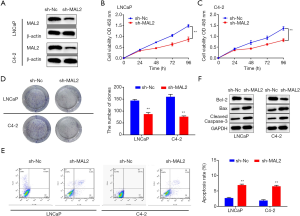 Next, a flow cytometry was performed to assess the cell apoptosis rates of LNCaP and C4-2 cells transfected with sh-MAL2. As expected, cell apoptosis was higher in LNCaP and C4-2 cells transfected with sh-MAL2 than those of the control group (see Figure 2E). A Western blot assay was used to measure the expression of cell apoptosis-related proteins (i.e., Bcl-2, Bax, and cleaved caspase-3). MAL2 silencing dramatically decreased the expression of Bcl-2, while increasing the expression of Bax and cleaved caspase-3 (see Figure 2F). All of the results suggested that MAL2 knockdown suppressed cell proliferation and promoted cell apoptosis in PRAD cells.