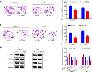 A Transwell assay was used to explore cell migration and the invasion ability of LNCaP and C4-2 cells. The results showed that cell migration was more blocked in LNCaP and C4-2 cells transfected with MAL2 knockdown than those of the control group (see Figure 3A). Similarly, cell invasion was significantly restrained by sh-MAL2 in LNCaP and C4-2 cells (see Figure 3B). A Western blot assay was used to detect expression levels of EMT related proteins. As Figure 3C shows, the expression of E-cadherin was dramatically increased in LNCaP and C4-2 cells transfected with MAL2 knockdown, and the expression of N-cadherin and Vimentin was decreased by sh-MAL2 (see Figure 3C). Thus, MAL2 knockdown was found to retard cell migration, invasion, and EMT progression in PRAD.