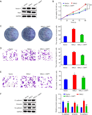 To detect the special mechanism of MAL2 in PRAD progression, MAL2 overexpression or Notch inhibitor-DAPT was transfected into LNCaP cells. A Western blot assay revealed that Notch-1 and Hes1 expression were obviously increased by MAL2 overexpression, but decreased by MAL2 + DAPT transfection (see Figure 4A). Next, cell proliferation was promoted by MAL2 overexpression, but inhibited by MAL2 + DAPT co-transfection (see Figure 4B,C). Further, cell migration and invasion were facilitated by MAL2 overexpression, but hampered by MAL2 + DAPT (see Figure 4D,E). In addition, DAPT was found to inhibit the effect of MAL2 on EMT progression in PRAD (see Figure 4F). Thus, MAL2 appears to regulate PRAD progression by modulating the Notch pathway.
