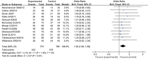 Twelve articles analyzed the 5-year survival rate in RCTs. The total number of cases comprised 1.292 patients, including 775 patients in the expt group and 766 patients in the ctrl group. The overall heterogeneity was tested (Chi2 =2.19, df =11, I2=0%, and P=1.00>0.1). The research results of Smith (2013) accounted for the highest percentage of the final combined results (12.9%), followed by those of Mmeje (2013) (12.1%). In addition, the horizontal line of the 95% CI of all the studies crossed the invalid vertical line. The FEM analysis results indicated that the difference between the expt group and ctrl group was not statistically significant (Z =2.57, OR =1.30, 95% CI: 1.06–1.59, and P=0.01<0.05; see Figure 6).