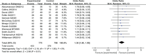 12 articles analyzed the 5-year survival rate in RCTs, and tested overall heterogeneity (Chi2 =2.19, df =11, I2=0%, and P=1.00>0.1). The analysis results of the FEM revealed that the 2 groups did not differ significantly. These results are consistent with those of Veskimäe et al. (2020) (16). A comparison of the combined effect values of the FEM and the REM indicated that the calculated results were almost the same under the different effects models, suggesting that the 12 included articles showed good sensitivity. In addition, the robustness and clinical similarity of the studies were high; thus, the final conclusions were reliable.