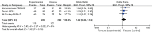 Three articles analyzed the 10-year survival rate in RCTs and tested the overall heterogeneity (Chi2 =0.40, df =2, I2=0%, and P=0.82). The horizontal line crossed with the invalid vertical line of the 95% CI. The analysis results of the FEM showed that the difference between 2 groups was not statistically significant (17). These findings are consistent with those of Campbell et al. (2018) (18). Six articles analyzed the 5-year DMR in RCTs and tested the overall heterogeneity (Chi2 =1.68, df =5, I2=0%, and P=0.89>0.1). The analysis results of the FEM indicated that the 2 groups showed no statistically observable difference, which was consistent with the findings of Almassi et al. (2020) (19).