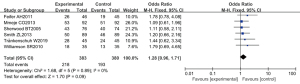 A total of 6 articles analyzed the 5-year DMR in RCTs. The total number of cases was 763, comprising 383 patients in the expt group and 380 patients in the ctrl group. The overall heterogeneity test showed Chi2 =1.68, df =5, I2=0%, and P=0.89>0.1 (see Figure 9). The research results of Mmeje (2013) accounted for the highest percentage (26.0%) of the final combined results, followed by the research results of Smith (2013) (37.7%). The horizontal line crossed the invalid vertical line of the 95% CI of the 6 articles; thus the FEM was adopted. The results showed that the difference between expt group and the ctrl group was not statistically significant (Z =1.70, OR =1.28, 95% CI: 0.96–1.71, and P=0.09>0.05).