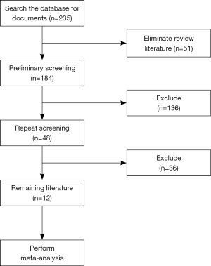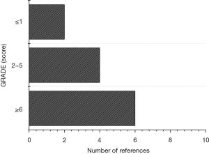 Two hundred and thirty-five articles were retrieved, 51 articles were excluded after checking their titles and abstract, leaving 184 articles remaining. One hundred and thirty-six articles were excluded from repeated publication and the first author could not be obtained, and 48 articles remained. After reading the full text, 36 articles were excluded and 12 articles were eventually included for meta-analysis. The specific process of article retrieval was shown in Figure 1. The main reasons for exclusion were as follows: duplicated research subjects; not the case-based randomized control analysis, no bladder cancer surgery for subjects, and available research information and data. Figure 2 shows the classification results based on the GRADE quality. Nine articles had scores ≥6, 7 articles had scores of 3–5, and 2 articles had scores ≤1.