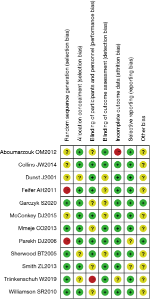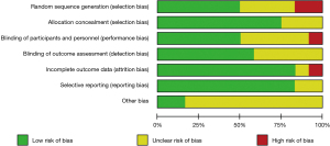 The assessment results of the bias risk of the included articles are shown in Figures 3 and 4, which were drawn using Review Manager 5.3 software. Among the 12 RCTs in this study, 3 articles (10-12) described the correct random allocation method, but only 2 articles (13,14) described both the correct random allocation method and the detailed allocation hiding. In addition, 1 article (15) adopted the blinding method. However, the measurement indicators in present study were laboratory indicators determined by computer; thus, all articles could be considered to have adopted the blinding method correctly.