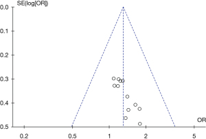 In this study, all of the 12 included articles were meta-analyzed using the REM, and changes in the combined effect value were calculated (see Figure 7). In relation to the combined 5-year survival rate, the results under the REM were as follows: OR =1.30, 95% CI: 1.06–1.59, and P=0.01. A comparison of the combined effect values of the FEM and REM showed that the calculated results were almost the same under the different models, indicating that the 12 included articles showed good sensitivity. In addition, the robustness and clinical similarity of the studies were high; thus, the final conclusion was reliable.