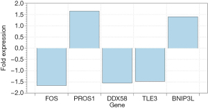 Comparing gene expression between CP/CPPS and control in blood showed moderate differences. The multidimensional scaling (MDS) plot showed broad overlap in all samples (data not shown). There were only 4 genes with expression >1.5× different in CP/CPPS vs. controls and a P value <0.05 (Figure 1), with 1 being lower in CP/CPPS and 3 being higher (see Table 1 for gene names and function). The only marginally significant gene set analysis difference between groups was for inflammatory signaling and NF-kB [significance score (SS) 1.11]. By contrast there were more differences seen for the UPOINT phenotypes that had sufficient heterogeneity in the sample. In our patient cohort nobody had the I domain (infection), only 1 didn’t have the U domain (urinary) and only 1 didn’t have the T domain (tenderness). As seen in Figure 2, the MDS plots for yes or no for Organ Specific, Psychosocial, and Neurogenic/Systemic all showed evidence for grouping. For Organ Specific (yes vs. no) there were 16 genes with significantly different expression led by BCL2A1 (−2.1× change, P=0.03), CST7 (−1.9× change, P=0.03) and IL1B (−1.9×, P=0.04). By gene set analysis grouping there were differences in carbohydrate metabolism (SS 1.4), lipid metabolism (SS 1.3) and NF-kB expression (SS 1.3). Neurologic/Systemic had no genes with differential expression and Psychogenic had only 1 and gene set analysis showed no clear pathway clusters.