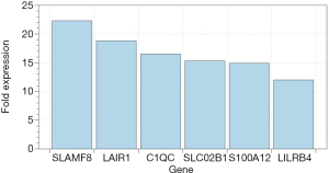 By contrast, gene expression between CP/CPPS and control urine samples showed more differences in extent and degree. MDS plots showed clear segregation between CP/CPPS and vasectomy (Figure 3). There were 48 genes with expression >1.5× different in CP/CPPS vs. controls and a P value <0.05 with greatest differences seen for SLAMF8 (22.3× higher, P=0.0004), LAIR1 (18.8× higher, P=0.004) and C1QC (16.5× higher, P=0.01) (Figure 4). Gene set analysis was different for a number of pathways including carbohydrate metabolism (SS 1.8), Neurons and Neurotransmission (SS 1.5), Adaptive Immunity (SS 1.4) and Inflammatory Signaling (SS 1.3). More impressive differences were seen between phenotypes. For Organ Specific (yes vs. no) there were 58 genes with significantly different expression led by S100A12 (−298× change, P=0.03), ILIRN (−65.3× change, P=0.008) and OSMR (−49.4×, P=0.004). By gene set analysis grouping there were differences in Astrocyte function (SS 1.6), Cytokine signaling (SS 1.5), Innate Immune Response (SS 1.5) and Growth factor signaling (SS 1.4). Neurologic/Systemic had 4 genes with differential expression including S100A12 (−121× change, P=0.009) and STEAP4 (−26.9× change, P=0.01). Gene set analyses did not show distinct groupings.