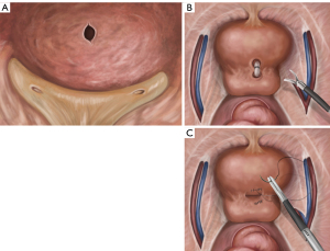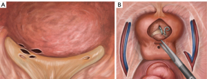 During the transition to the laparoscopic approach, the first aim was to reproduce the O’Connor transabdominal-transvesical technique, but the extravesical procedure has also shown good results with a success rate of 98% (12). In our opinion, the choice will depend on several factors: (I) the proximity of the fistula’s orifice to the ureteral meatus, (II) the number of fistulous tracts, (III) the location of the fistula, (IV) surgeon’s preference and/or experience.