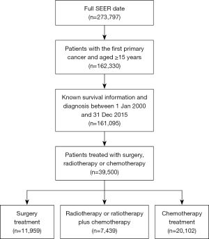 Among the 273,797 BCa cases recorded in SEER database, 162,330 (59.3%) patients were first primary cancer and aged over 15 years old. Of these patients, 161,095 (99.3%) were diagnosed with BCa and had full survival data between January 1st 2000 and December 31st 2015. Among these patients, 39,500 (24.5%) were treated with surgery, RT, or CT and were eligible for inclusion in this study (Figure 1).