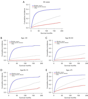 We compared the cumulative mortality in patients with BCa in terms of three different causes of mortality: tumor-specific death, diseases of the heart, and other causes. Among all patients, the cumulative incidence of BCa was the highest, which was nearly four times the figure for diseases of the heart and twice the figure of other causes in patients who survived 50–200 months after diagnosis. Specifically, for patients with a survival period of less than 50 months, tumor-specific death exhibited a rapidly increasing trend, which subsequently flatlined. However, compared to tumor-specific mortality, However, the rates heart-specific mortality and other causes exhibited a tendency to increase stably. This suggests that there will be a continuous rise in the number in patients who live longer (Figure 2A).