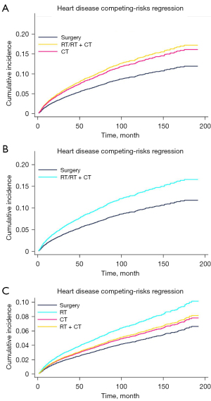 A general analysis has shown that older patients have a higher potential for death due to cardiac-specific causes. At present, the influence of age on the risk of cardiovascular disease cannot be ruled out. The significant enhancement of medical oncology treatment, especially the clinical application of immunotherapy, enables patients to achieve a longer survival period, combined with the risk factors of degenerative changes in aging patients. Therefore, we further stratified our assessment based on age and tried to eliminate the problems of aging and degeneration caused by age itself. For patients over 65 years who received RT, the heart-specific mortality rate was significantly higher than that of the RC and CT groups. Meanwhile, the heart-specific mortality risk of the other age groups who received any of the three treatments was not significant different to that of the general population.