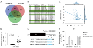 MicroRNA regulation of tumor-related genes is one of the most important regulatory patterns in the process of tumor growth. To understand the miRNAs which directly target QKI-5, QKI-5-targeted miRNAs were investigated using Targetscan, Starbase, and miRWalk. In total, from the three databases, 304 common miRNAs were predicted to bind with QKI-5 directly (Figure 5A). Further analysis showed that there were six miRNAs that showed negative correlations with QKI-5 using KIRC data from TCGA. and miR-200c, which showed the most negative correlations, including miR-200c (r=−0.592), miR-96-5p (r=−0.368), miR-429 (r=−0.366), miR-200b-3p (r=−0.347), miR-141-3p (r=−0.320), and miR-4784 (r=−0.307) (Figure 5B,5C). Therefore, miR-200c was selected for further analysis. It showed that the expression of miR-200c was significantly upregulated in KIRC tissues compared with normal tissues (Figure 5D). Furthermore, it showed that a binding site (UAAGACA) existed of miR-200c in the 3’UTR of QKI-5 (Figure 5E). A dual-luciferase reporter assay showed that compared with the NC (non-specific control) group, the expression of luciferase was significantly inhibited in the QKI-5 wild-type group when supplemented with miR-200c mimic, while there was no significant difference in the expression of luciferase, when the miR-200c binding sites of QKI-5 were mutated (Figure 5F). These results demonstrate that QKI-5 is one of the directly binding targets for miR-200c.