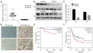 It has been proven that QKI-5 is downregulated in KIRC samples corresponding to noncancerous normal tissues. Consistent with these results, qRT-PCR and western blot analysis showed that the expression of QKI-5 was significantly downregulated in KIRC tissues compared to normal kidney tissues (Figure 1A-1C). However, we found that the expression of QKI-5 was dramatically elevated in metastatic KIRC compared to primary KIRC using immunohistochemical staining (Figure 1D), suggesting that QKI might play crucial roles in the metastasis of KIRC. Further analysis showed that lower QKI-5 expression level demonstrated better overall survival during both the T3 and T4 periods of KIRC (Figure 1E,1F).