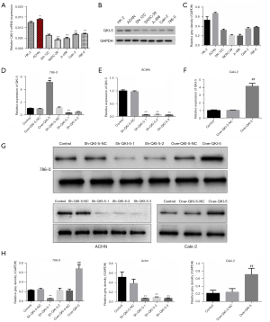 To understand the function of QKI-5 in KIRC, the expression of QKI-5 in different kidney cells was investigated using qRT-PCR and western blot. As Figure 2A-2C show, compared with HK-2 cells (human renal tubular epithelial cells), the expression of QKI-5 was significantly elevated in ACHN cell (cell line which was initiated from malignant pleural effusion of metastatic renal adenocarcinoma) while it was downregulated in SN-12C, SKRC-39, A-498, Caki-2, and 786-0 cells. To assess the expression levels of cell cultures, a suppressing QKI-5 ACHN cell line, an overexpressing the QKI-5 Caki-2 cell line, and overexpressing and suppressing QKI-5 786-0 cells were generated and used for further study. As Figure 2D-2H shows, QKI-5 was successfully downregulated in ACHN and 786-0 cells and upregulated in 786-0 and Caki-2 cell lines, suggesting that these cell lines could be used for further analysis.