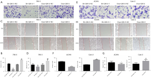 To understand the effect of QKI-5 on the progression of KIRC, migration and invasion were detected in 786-0, ACHN, and Caki-2 cell lines through overexpressing or suppressing the expression of QKI-5. As Figure 3A,3B show, invasion was significantly blocked in the sh-QKI-5-1 group compared with the sh-QKI-5-NC group, while it was enhanced in the Over-QKI-5 group compared with the Over-QKI-5-NC group in 786-0 cells. The migration ability detection results showed that the migration rate of the 786-0 cells was significantly decreased when suppressing QKI-5 expression, while it was dramatically increased when overexpressing QKI-5 expression in 786-0 cells (Figure 3C,3D). In addition, downregulation of QKI-5 expression in ACHN cells significantly decreased the invasion and migration ability of ACHN cells, while upregulation of QKI-5 expression in Caki-2 cells significantly elevated the invasion and migration ability of Caki-2 cells (Figure 3E-3H). These results demonstrate that upregulation of QKI-5 promotes cell migration and invasion.